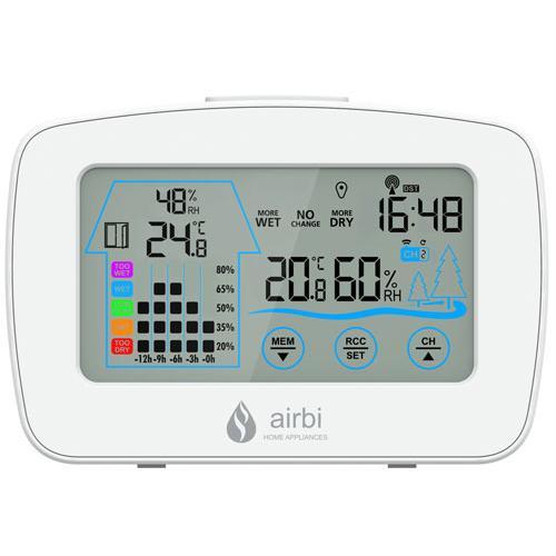 Termo-Higrómetro Digital sem Fios O Termo-Higrómetro digital sem fios Airbi Control mede a temperatura ambiente num intervalo de -10°C a +50°C e a humidade relativa entre 20% e 95%. O conjunto inclui um sensor sem fios de temperatura e humidade, que comunica com a estação base. Este sensor pode ser utilizado tanto no interior como no exterior. Além dos valores atuais, o ecrã mostra também os valores mínimos e máximos registados desde o último reinício manual. O que está incluído: 1 estação base 1 sensor sem fios para temperatura e humidade Ecrã e funcionalidades O Airbi Control apresenta a hora atual e permite acompanhar graficamente a evolução da humidade interior. O ecrã inclui também ícones informativos úteis, como: Sugestões de ventilação Alertas de formação de bolor Avisos de geada Tendência prevista da humidade interior Características principais Mede temperatura e humidade no interior Inclui sensor sem fios para monitorizar outra divisão ou o exterior Suporta até três sensores sem fios adicionais Memória para valores mínimos e máximos Relógio com hora controlada por rádio (RCC) Gráficos da evolução da humidade ao longo do tempo Dicas de ventilação através de ícones Avisos de geada e risco de bolor